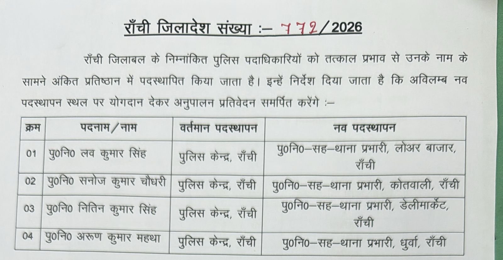 इसके अलावा डेली मार्केट थाना में नितिन कुमार सिंह को थाना प्रभारी नियुक्त किया गया है। वहीं धुर्वा थाना की जिम्मेदारी अरुण कुमार महथा को दी गई है।