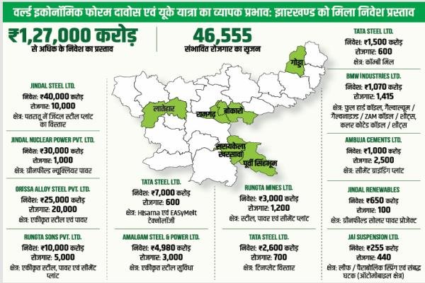 इन निवेश प्रस्तावों में टाटा स्टील और नवीन जिंदल समूह का बड़ा योगदान है। इनके अलावा स्टील, पावर, सीमेंट, ऑटोमोबाइल और मैन्युफैक्चरिंग सेक्टर से जुड़ी कई कंपनियों ने राज्य में उद्योग लगाने की इच्छा जताई है। इससे झारखण्ड न केवल स्टील हब बनेगा, बल्कि ग्रीन एनर्जी और आधुनिक तकनीक आधारित उद्योगों का केंद्र भी बनेगा।