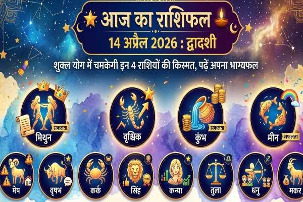 Aaj Ka Rashifal 14 April 2026: वैशाख मास के कृष्ण पक्ष की द्वादशी तिथि और मंगलवार का दिन ज्योतिषीय दृष्टि से बेहद खास है। आज दोपहर तक शुक्ल योग का निर्माण हो रहा है, जो कई राशियों के लिए सफलता के द्वार खोलेगा। ज्योतिषियों के अनुसार, आज मिथुन राशि को सरकारी क्षेत्र से लाभ होगा, वहीं वृश्चिक राशि के जातकों को करियर में बड़ी ऊंचाइयों छूने का मौका मिलेगा।