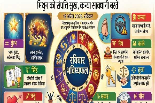 Aaj Ka Rashifal 19 April 2026: ज्योतिष शास्त्र के अनुसार, 19 अप्रैल 2026, रविवार का दिन ग्रहों के विशेष संयोग के कारण बेहद शुभ रहने वाला है। आज वैशाख शुक्ल पक्ष की तृतीया तिथि और आयुष्मान योग का निर्माण हो रहा है, जो रात 08:01 तक रहेगा। यह योग दीर्घायु और सफलता का प्रतीक माना जाता है।
