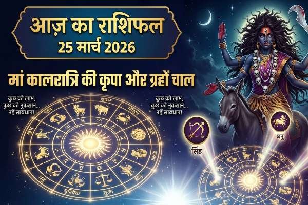 Aaj Ka Rashifal 25 March 2026: बुधवार, 25 मार्च 2026 का दिन ज्योतिषीय दृष्टि से अत्यंत महत्वपूर्ण है। आज चैत्र नवरात्रि की सप्तमी तिथि है, जिसमें मां कालरात्रि की पूजा का विधान है। ग्रहों के गोचर के अनुसार आज का दिन सभी 12 राशियों के लिए मिश्रित परिणाम लेकर आया है। जहां कुछ राशियों को व्यापार और करियर में बड़ी सफलता मिलेगी, वहीं कुछ के लिए सावधानी बरतने का संकेत है।