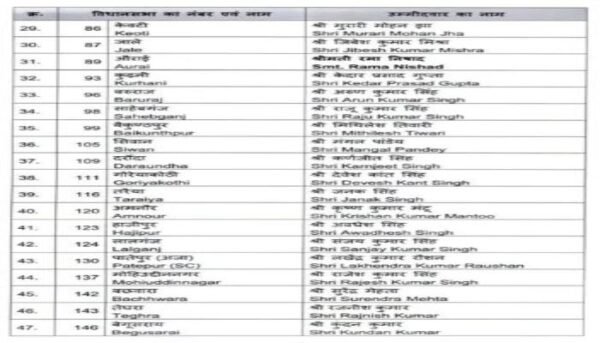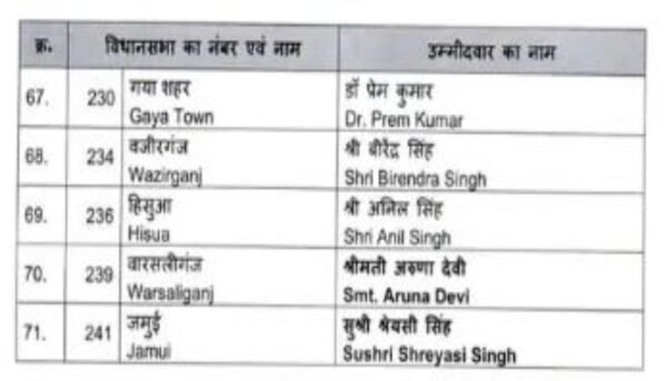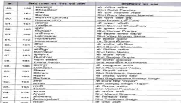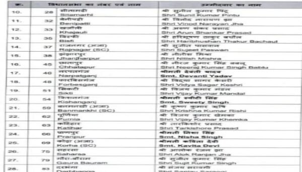 बीजेपी के द्वारा जारी किये गए पहली लिस्ट में 9 महिलाओं को मौका दिया गया है। इस लिस्ट में डॉक्टर सुनील कुमार, डॉ. प्रेम कुमार, संजय सरावगी, मंत्री मंगल पांडे, जीवेश मिश्रा, राजू सिंह, कृष्ण कुमार मंटू, सुरेंद्र मेहता और नीरज कुमार बबलू शामिल है।