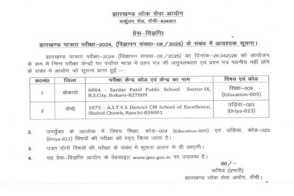 Big Breaking: बड़ी खबर निकलकर निकलकर सामने आ रही है। जेपीएससी ने झारखंड पात्रता परीक्षा 2026 की दो विषयों की परीक्षा को रद्द कर दिया है। इससे जुड़ी अधिसूचना आधिकारिक तौर पर जारी कर दिया गया है। जेपीएससी ने बताया कि प्रश्न पत्रों की उपलब्धता नहीं होने कारण यह कदम उठाया गया है।