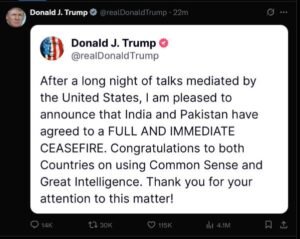 भारत और पाकिस्तान ने अमेरिका की मध्यस्थता में हुई लंबी और गहन वार्ताओं के बाद पूर्ण और तत्काल संघर्षविराम पर सहमति जता दी है।