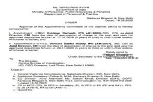 कार्मिक एवं प्रशिक्षण विभाग (DoPT) की ओर से जारी आदेश के मुताबिक, कैबिनेट की नियुक्ति समिति (ACC) ने केंद्रीय जांच ब्यूरो (CBI) में संयुक्त निदेशक के रूप में दोनों वरिष्ठ आईपीएस अधिकारियों की नियुक्ति को मंजूरी दे दी है।