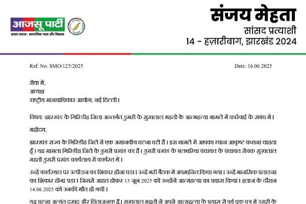 Jharkhand: डुमरी प्रखंड में पंचायत सेवक सुखलाल महतो की आत्महत्या के मामले ने अब राष्ट्रीय स्तर पर तूल पकड़ लिया है। इस संवेदनशील मामले में आजसू पार्टी के नेता संजय मेहता ने राष्ट्रीय मानवाधिकार आयोग (NHRC), नई दिल्ली को पत्र लिखकर दोषियों के खिलाफ कड़ी कार्रवाई की माँग की है।