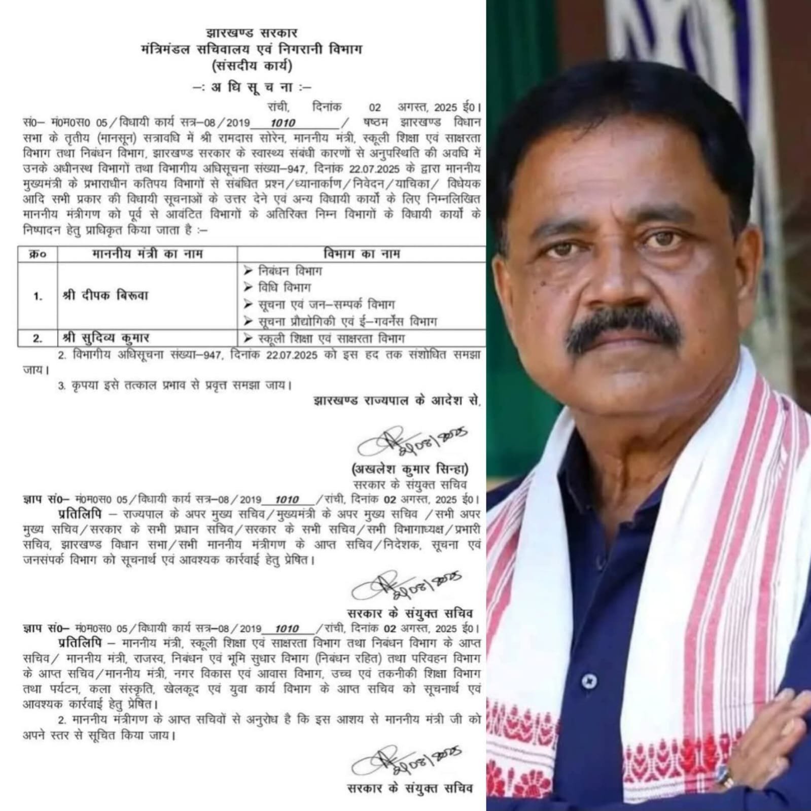 दीपक बिरुवा को निबंधन विभाग, विधि विभाग, सूचना एवं जनसंपर्क, और ई-गवर्नेंस विभाग की अतिरिक्त जिम्मेदारी दी गई है।