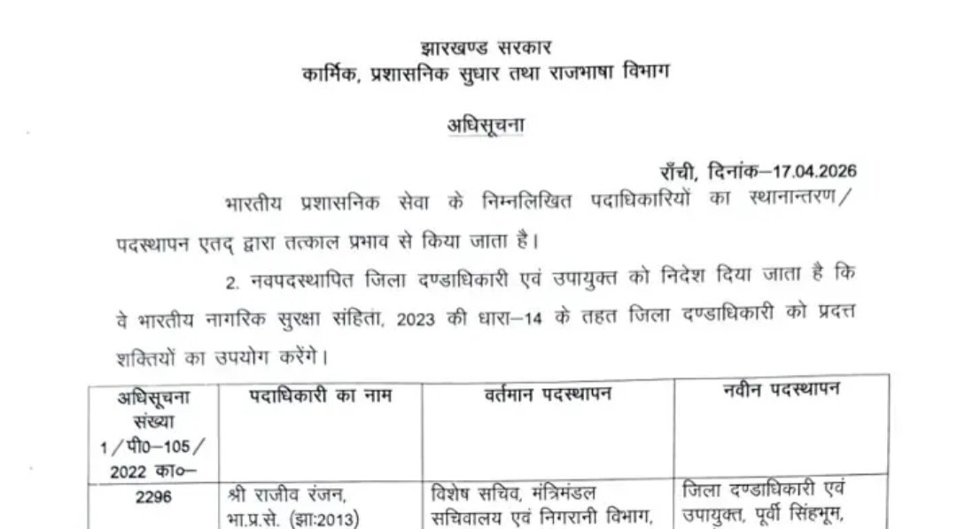 इसके अलावा शशि प्रकाश सिंह को देवघर, वकार हसन को कोडरमा, जितेंद्र सती को सरायकेला-खरसावां, नैंसी सहाय को रामगढ़ और अमित कुमार को चतरा का उपायुक्त बनाया गया है। सरकार ने सात जिलों के उपायुक्तों के कार्यक्षेत्र में भी बदलाव किया है, जिससे प्रशासनिक कार्यों में तेजी और बेहतर समन्वय की उम्मीद जताई जा रही है।