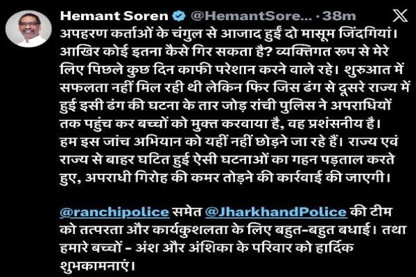 सीएम ने दोनों बच्चों को सकुशल बरामद किये जाने के बाद रांची पुलिस औऱ झारखंड पुलिस की टीम को तत्परता और कार्यकुशलता के लिए बहुत-बहुत बधाई दी है। इसके साथ ही अंश और अंशिका के परिवार को हार्दिक शुभकामनाएं।