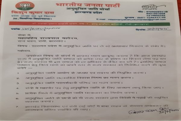 Jharkhand News: भारतीय जनता पार्टी अनुसूचित जाति मोर्चा, झारखंड प्रदेश के अध्यक्ष किशुन कुमार दास ने बुधवार को राजभवन, रांची में राज्यपाल से शिष्टाचार मुलाकात कर अनुसूचित जाति समाज पर हो रहे अत्याचारों की रोकथाम और अधिकारों की रक्षा के लिए एक मांग-पत्र सौंपा। उन्होंने राज्य में दलित समुदाय से जुड़ी समस्याओं और आवश्यक सुधारों को लेकर कई अहम सुझाव दिए।