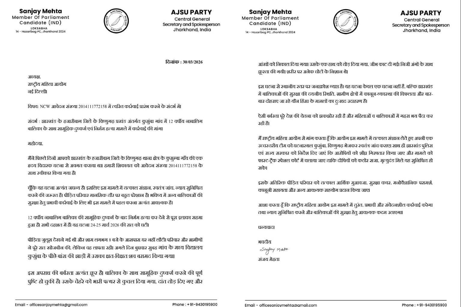 झारखंड के हजारीबाग जिले के विष्णुगढ़ प्रखंड अंतर्गत कुसुंभा गांव में हुए दिल दहला देने वाले दुष्कर्म और हत्या मामले में अब राष्ट्रीय महिला आयोग (NCW) ने संज्ञान लेते हुए मामला दर्ज कर लिया है। यह कार्रवाई AJSU पार्टी की पहल के बाद संभव हो सकी है।
