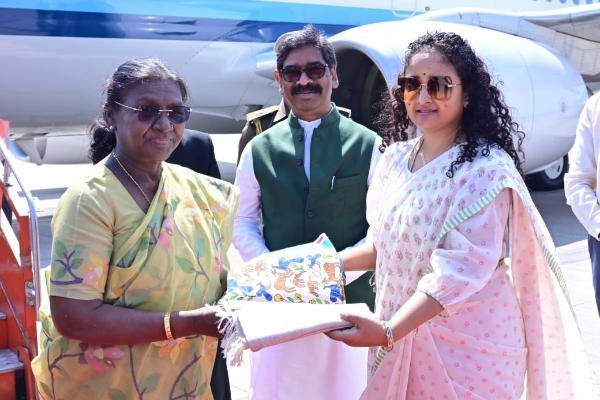 राष्ट्रपति द्रौपदी मुर्मू (Draupadi murmu) आज एक दिवसीय झारखंड दौरे पर एयरफोर्स के विशेष विमान से रांची एयरपोर्ट आ गयी हैे, रांची के बिरसा मुंडा एयरपोर्ट पर राष्ट्रपति द्रौपदी मुर्मू का भव्य स्वागत किया गया। राष्ट्रपति द्रौपदी मुर्मू के स्वागत के लिए हेमन्त सोरेन और कल्पना सोरेन रांची के बिरसा मुंडा एयरपोर्ट पर मौजुद रहे। यहां से वो हेलीकॉप्टर से जमशेदपुर के सोनारी एयरपोर्ट के लिए रवाना होंगी। राष्ट्रपति के आगमन को लेकर संबंधित एजेंसियों को हाई अलर्ट पर किया गया है साथ ही एयरपोर्ट परिसर में सुरक्षा व्यवस्था भी बढ़ा दी गई है। दौरे को मद्देनजर रखते हुए राजधानी रांची समेत जमशेदपुर में विशेष सुरक्षा व्यवस्था लागू कर दी गई हैं।