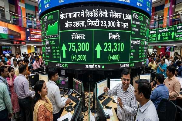 आज यानी 25 मार्च, 2026 को भारतीय शेयर बाजार (Stock Market) में जबरदस्त रौनक देखी जा रही है। हफ्ते के तीसरे कारोबारी दिन बाजार की शुरुआत शानदार बढ़त के साथ हुई। सेंसेक्स (Sensex) लगभग 1,200 अंकों की छलांग लगाकर 75,300 के स्तर पर कारोबार कर रहा है, वहीं निफ्टी (Nifty) भी 400 अंकों की तेजी के साथ 23,300 के पार निकल गया है।