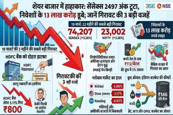 Stock Market Crash: भारतीय शेयर बाजार के लिए आज यानी 19 मार्च 2026 का दिन ‘ब्लैक थर्सडे’ साबित हुआ। सेंसेक्स और निफ्टी में पिछले 22 महीनों की सबसे बड़ी एकदिवसीय गिरावट दर्ज की गई। ईरान-इजराइल युद्ध के बढ़ते तनाव और वैश्विक अस्थिरता के बीच निवेशकों ने भारी बिकवाली की, जिससे बाजार धराशायी हो गया।