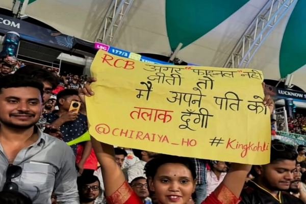 वहीं मैच के दौरान एक महिला फैन ने ऐसा पोस्टर दिखाया कि वो सोशल मीडिया पर वायरल हो गई. उसमें लिखा था – “अगर RCB ट्रॉफी नहीं जीतती तो मैं अपने पति को तलाक दे दूंगी!” यह पोस्टर कैमरामैन ने कैद कर लीया और सोशल मीडिया पर इसका तूफान बन गया.